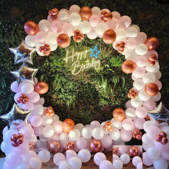 "Transform your celebrations into unforgettable memories with our stunning balloon and room décor. From elegant silver and pink balloons to romantic rose petals, we create the perfect setting for birthdays.