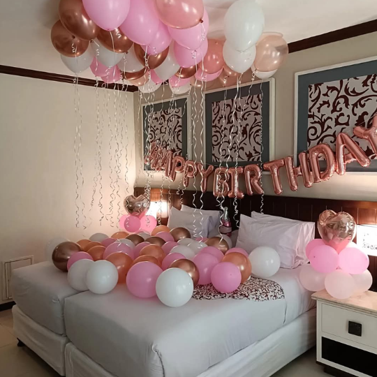 "Transform your celebrations into unforgettable memories with our stunning balloon and room décor. From elegant silver and pink balloons to romantic rose petals, we create the perfect setting for birthdays.